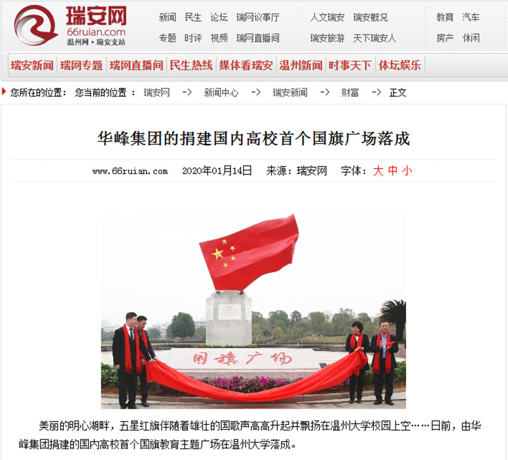 美丽的明心湖畔,五星红旗伴随着雄壮的国歌声高高升起并飘扬在温州大学校园上空……日前,由ag亚娱集团捐建的国内高校首个国旗教育主题广场在温州大学落成。