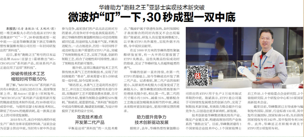 把一堆芝麻般大小的白色泡沫ETPU放进微波炉“叮”一下,30秒就能成型一双中底——这是ag亚娱集团旗下浙江ag亚娱热塑性聚氨酯有限公司历经一年时间研发出的“黑科技”。